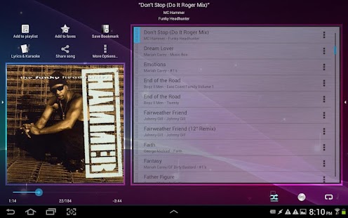 - Varias opções de Controle de Tela de Bloqueio , incluíndo Controles Básicos (ICS +) , Controles AVANÇADOS de mini- jogadores (ICS +) , OU um 4 × 2 widget ( Android 4.2 +).